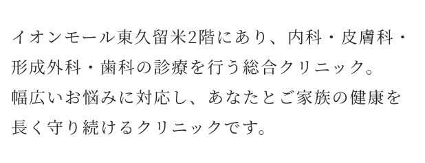 東久留米おだやかメディカルクリニックは、内科・皮膚科・形成外科・歯科を備えた総合クリニックです。風邪や肌のトラブル、ケガやお口の健康まで、幅広い診療を行っています。当院の特徴は、医科と歯科が連携し、全身の健康を考えた診療ができること。例えば、歯の治療をきっかけに生活習慣や体調の変化を見つけることも可能です。「とりあえず相談してみよう」と気軽に来ていただける、そんなクリニックを目指しています。地域の皆さまが、健康に関する不安を感じたときにすぐに頼れる場所でありたい—その想いを大切に、一人ひとりに寄り添った診療を行ってまいります。